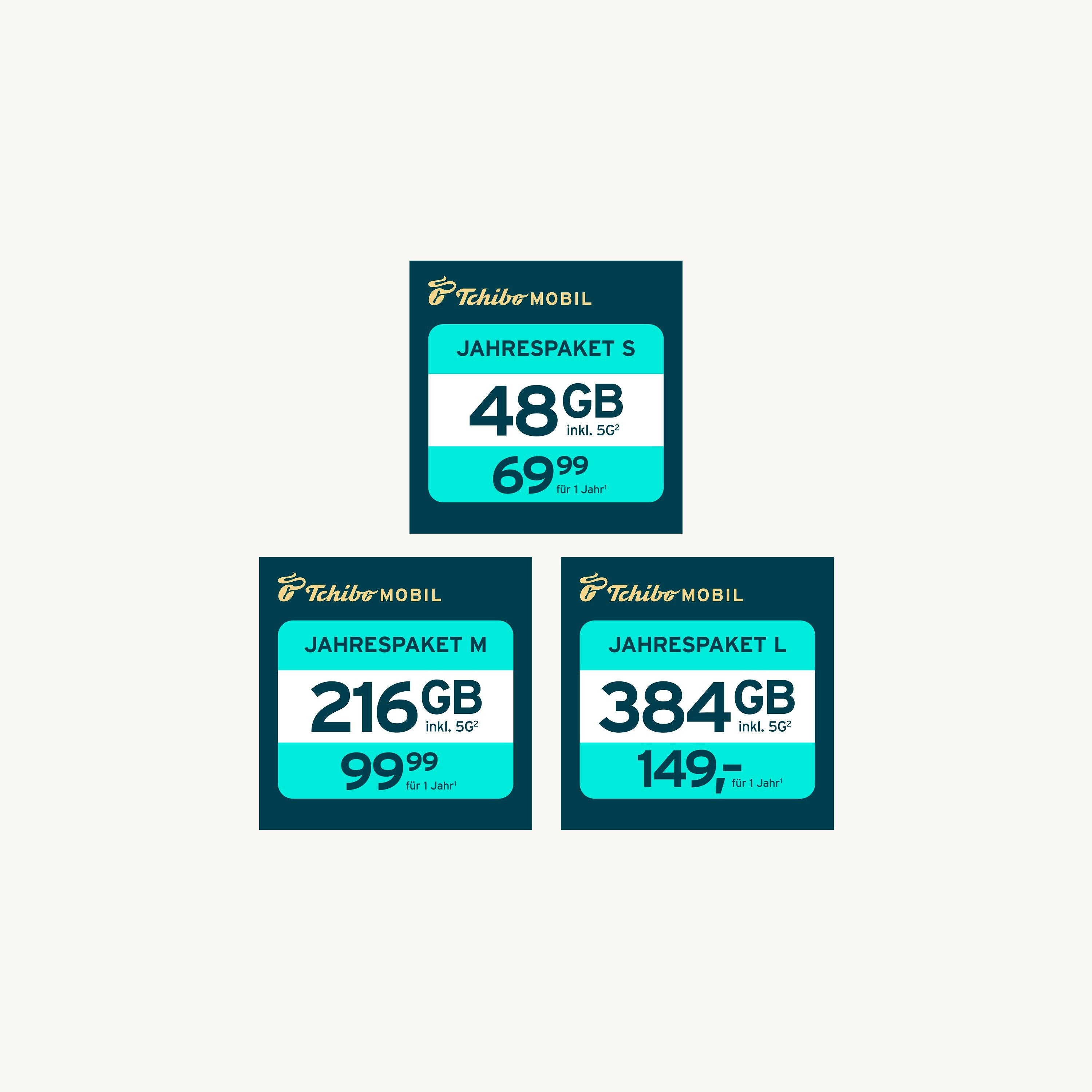 Zahlen Sie einmal und surfen und telefonieren Sie 12 Monate – mit den Tchibo Jahrespaketen. 48-384 GB Datenvolumen machen Sie weitgehend unabhängig von Hotspots und WLAN. Und ob Sie in alle deutschen Netze von Deutschland oder dem EU-Ausland telefonieren, es ist alles inklusive. Der Tarif verlängert sich dabei nicht automatisch – alles untersteht Ihrer Kontrolle.