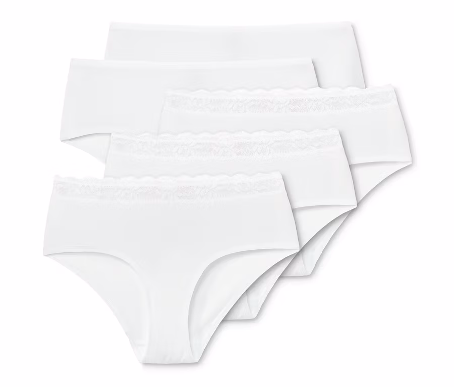 Manchmal mögen wir es mit Spitze, manchmal mögen wir es schlicht – aber in jedem Fall haben wir es gerne bequem. Und mit diesen Pantys gibt es fünf komfortable Damenunterhosen, von denen drei am Bund mit weicher Spitze besetzt sind, während die anderen beiden pur gehalten sind. Mit ihrer soften Microtouch-Qualität liegen die Slips angenehm weich auf der Haut, Elasthan sorgt dabei für Formbeständigkeit, einen perfekten Sitz und zusätzlichen Tragekomfort. Die Höschen haben Baumwollzwickel und können optisch mit seidigem Glanz punkten. Sie sind klassisch geschnitten und lassen sich im klassischen Weiß oder im eleganten Dunkelblau wunderbar mit anderen Wäschestücken kombinieren.
