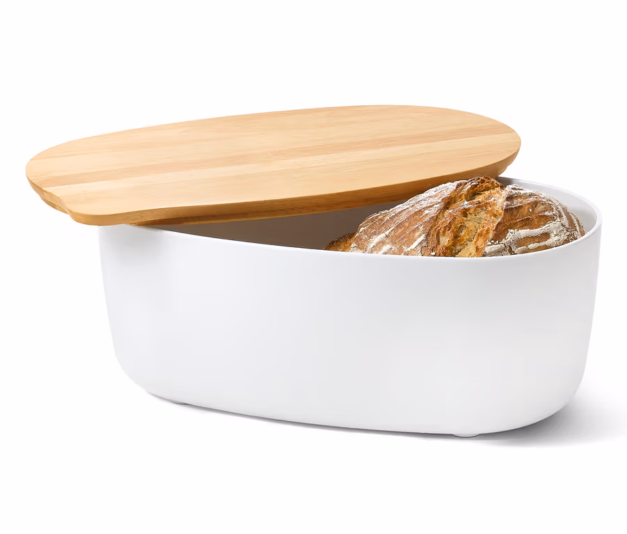 Bei diesem weißen Brotkasten mit hölzernem Deckel handelt es sich um eine puristische Schönheit. Sein klares Design ist besonders elegant und passt zu jedem Einrichtungsstil. Außer seinem Aussehen hat der Kasten weitere Highlights zu bieten: So kann der robuste Deckel auch als Schneidebrett genutzt werden. Und wer auf das Saugen nach dem Brotschneiden verzichten möchte, nimmt die Rückseite des Holz-Deckels als Unterlage, denn diese hat eine Rillenstruktur, welche die Brotkrümel auffangen kann.