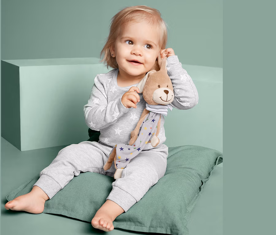 - Klettverschluss am Ohr zum Befestigen eines Schnullers