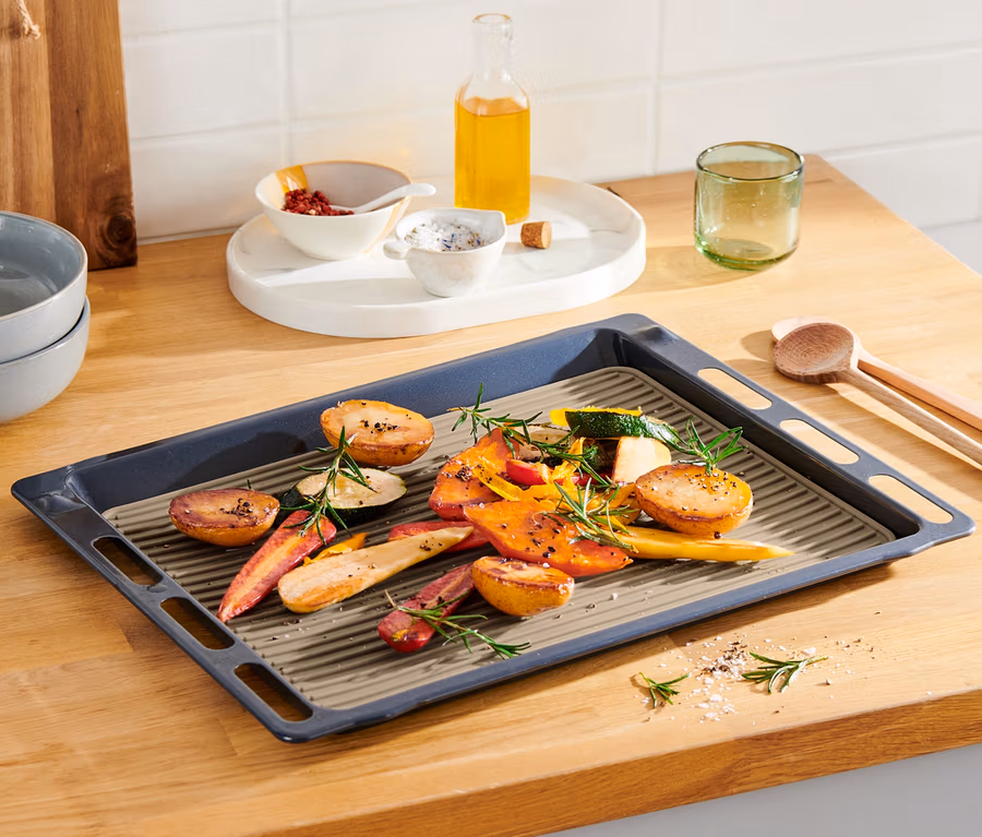 - Oberseite mit Rillenstruktur zum fettarmen Backen ‒ Fett kann abfliessen und Luft zirkuliert optimal