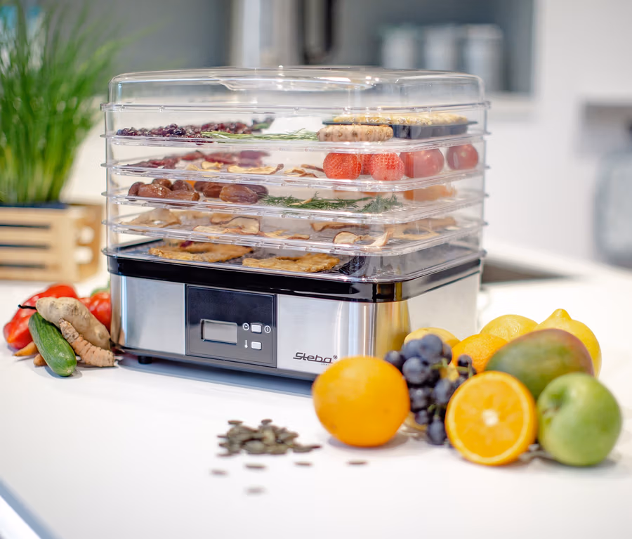 - Zum gleichzeitigen Dörren auf mehreren Etagen – braucht wenig Platz in der Küche