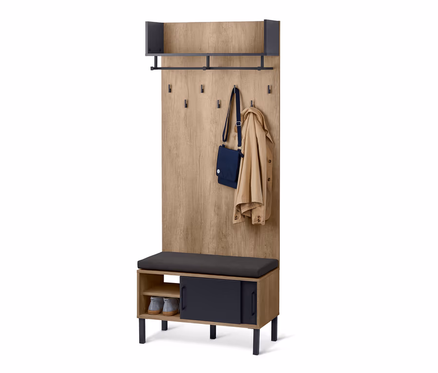 Die Garderobe hat eine Reling, an der sich zum Beispiel Jacketts am Kleiderbügel aufhängen lassen, sowie sieben Haken für Jacken und Mäntel. Die darüberliegende Ablage ist ideal für Hüte, Caps und Mützen geeignet. Unter der Bank gibt es hinter den Schiebetüren einen Einlageboden mit jeder Menge Platz für Schuhe.