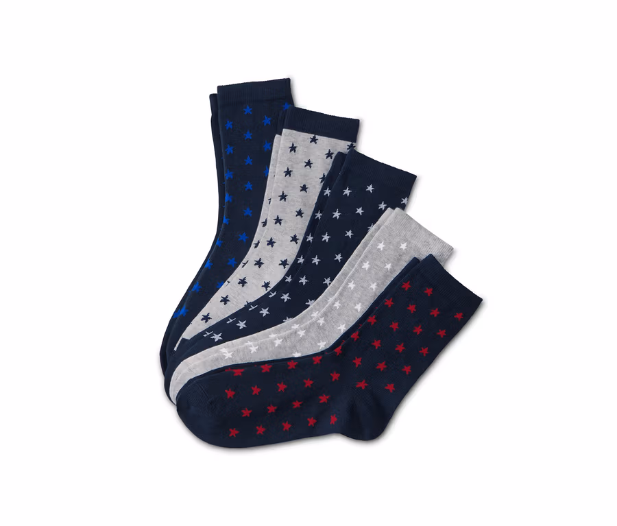 - 1x dunkelblau mit rotem Sternen-Alloverdessin, 1x grau meliert mit weißem Sternen-Alloverdessin, 1x dunkelblau mit weißem Sternen-Alloverdessin, 1x grau meliert mit blauem Sternen-Alloverdessin, 1x dunkelblau mit mittelblauem Sternen-Alloverdessin