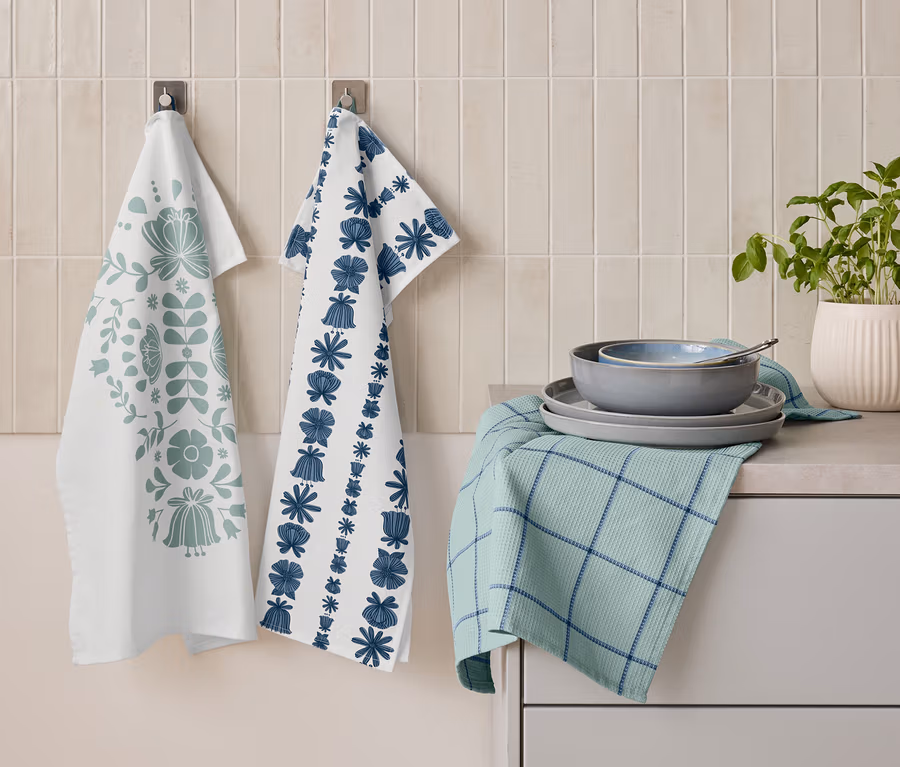 - 1x salbeigrün mit Waffelstruktur, 1x weiß mit dunkelblauem Skandi-Muster, 1x weiß mit salbeigrünem Skandi-Muster