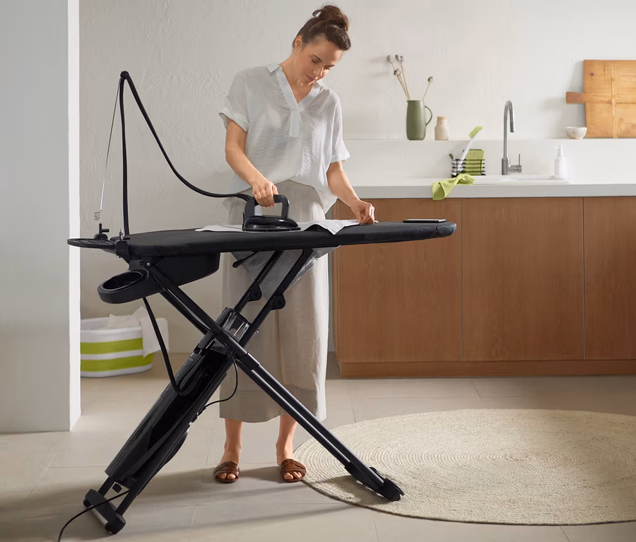 - Bügeleisen mit 3D-Sohle und Aktivbügelbrett mit Gebläse verhindern Falten