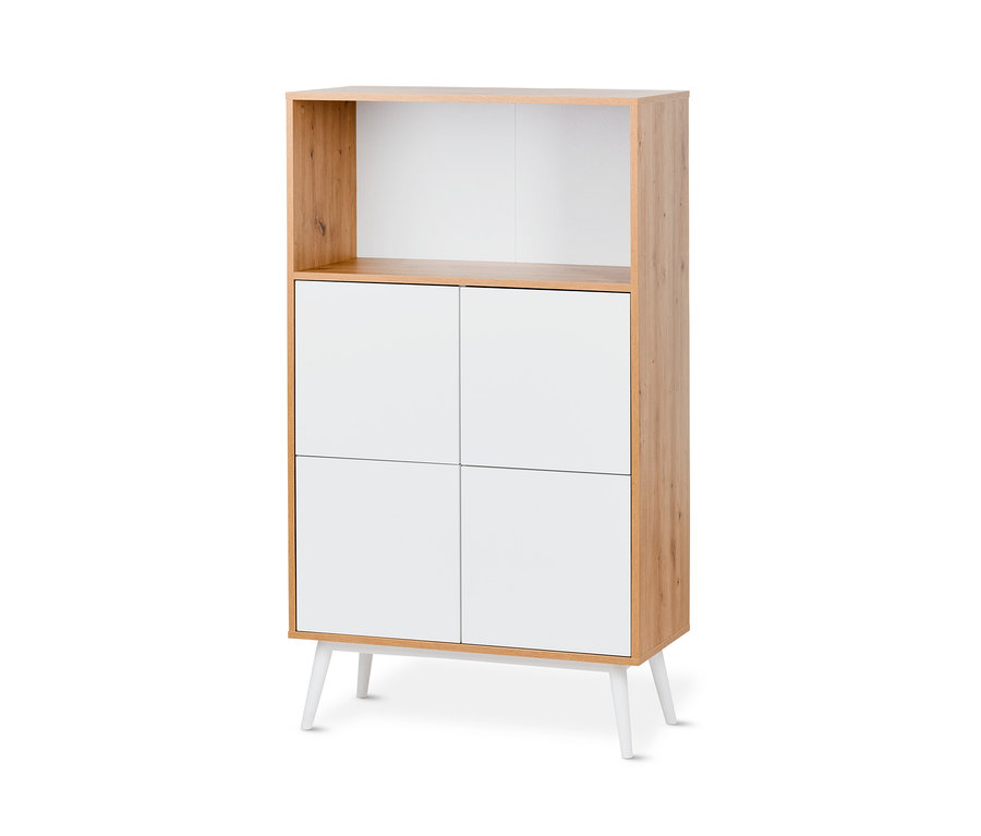 Der Ordnungsschrank hat ein oberes offenes Fach, in dem alles untergebracht werden kann, was man öfter zur Hand nimmt oder gerne griffbereit hat – es eignet sich aber auch gut für Ordnungsboxen, in denen kleinere Accessoires aufbewahrt werden. Darunter gibt es hinter vier Türen je ein geräumiges Fach für die verschiedenen Putzutensilien und kompaktere Gerätschaften wie Handstaubsauger oder Bügeleisen.