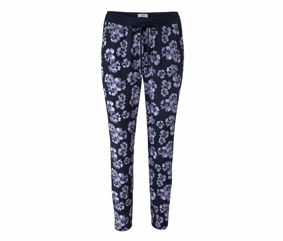 Lässig fallende Webhosen mit floralem Alloverprint sind nicht nur schwer im Trend – sie sind vor allem unwahrscheinlich bequem. Diese hier ist knöchellang, besteht aus weich fließender, leicht gekreppter Webware und hat einen breiten, elastischen Komfortbund mit Tunnelzug. Der Bund lässt sich mit einem Bindeband in seiner Weite anpassen. Für den besonders durchgestylten Auftritt kommt diese Hose mit Galonstreifen an der Seitennaht und zwei Zier-Gesäßtaschen daher. Vorne hat die Webhose zwei Eingrifftaschen.