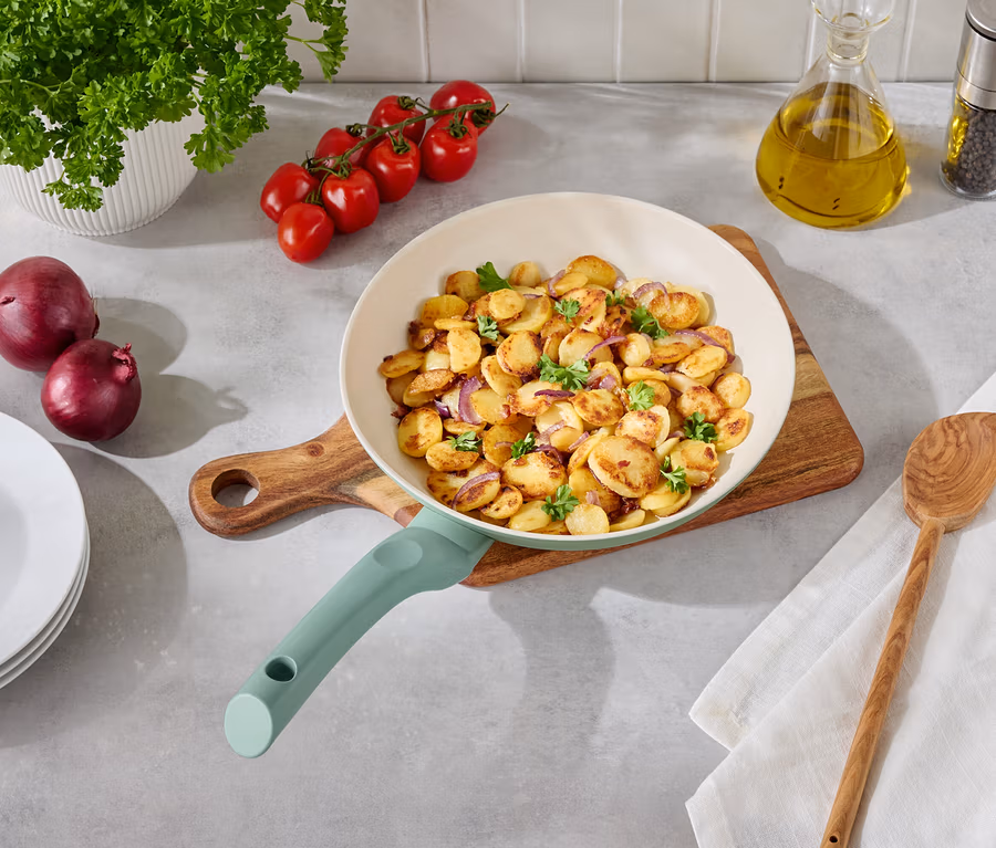 - Komplett ohne PFAS-Rohstoffe hergestellte Qualitäts-Antihaftbeschichtung – ideal für fettarmes Braten, vermindert Anbrennen und Festsetzen, schützt vor Kratzern, einfach zu reinigen