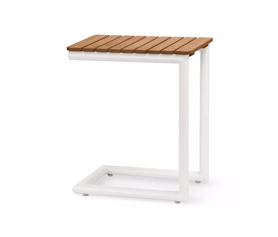 Ob im Wohnzimmer, auf der Terrasse oder in der Gartenlounge: Dieser vielseitig einsetzbare Beistelltisch lässt sich wunderbar mit vorhandenen Möbeln kombinieren und als Ablage einsetzen. Das asymmetrische Aluminiumgestell ist an einer Seite offen, so dass der Fuß unter das Sofa geschoben werden kann und die Tischplatte darüber „schwebt“ – so wird er im Innen- oder Außenbereich zum stylischen Hingucker. Die Tischplatte ist aus hochwertigem, FSC®-zertifiziertem Eukalyptusholz gefertigt, das UV- sowie witterungsbeständig lackiert ist und mit seiner natürlichen Farbe einen warmen Akzent setzt.