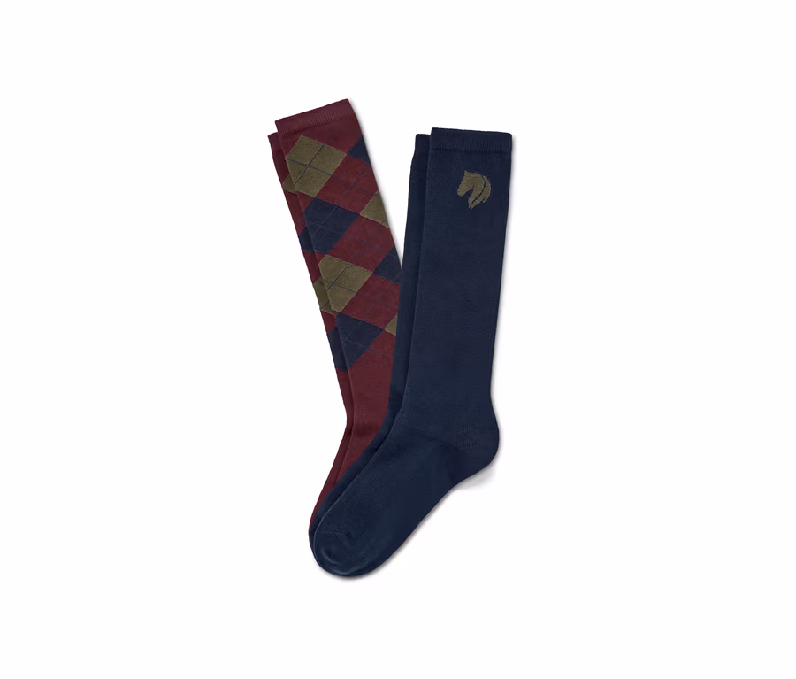 - 1x dunkelblau mit olivgrünem Pferde-Einstrick, 1x bordeauxrot mit dunkelblau-olivgrünem Argyle