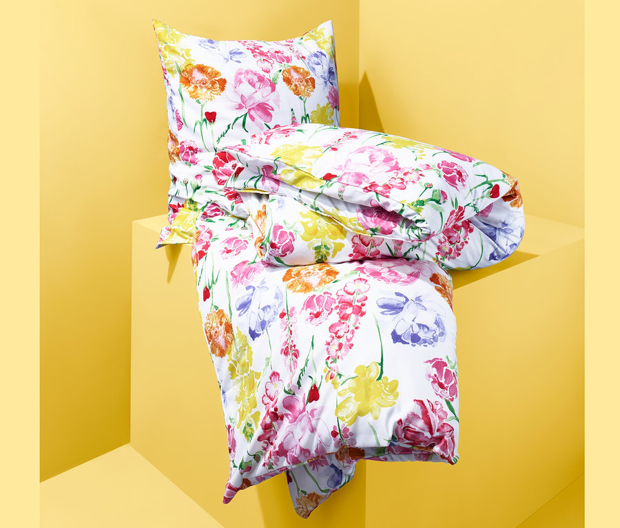 Der Stoff ist schnelltrocknend, bügelfrei und mit einem Blumenprint versehen, der mit seinen Farben ideal in die warme Jahreszeit passt. Dank Reißverschluss sind Kissen und Decke im Handumdrehen bezogen.