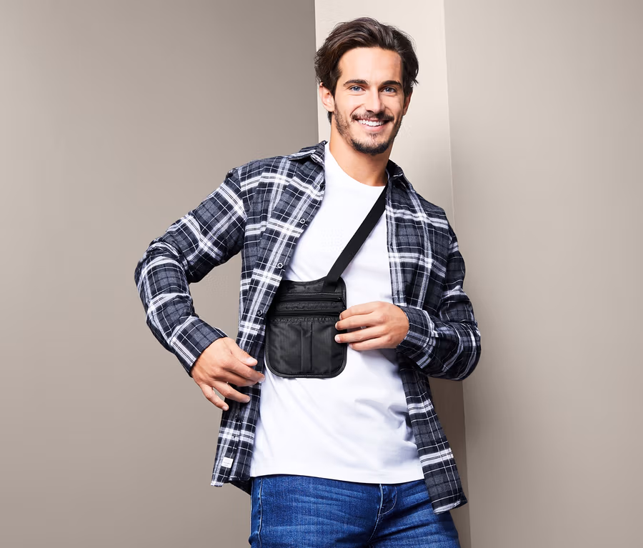 Wer auf Reisen gerne alles Wichtige griffbereit dabeihat, sollte dafür sorgen, dass es auch sicher verstaut ist – und mit dieser Sicherheitstasche liegt man dabei absolut richtig. Sie hat einen längenverstellbaren Schultergurt und mit ihrem flachen, anschmiegsamen Design lässt sie sich auch unauffällig unter der Kleidung tragen.