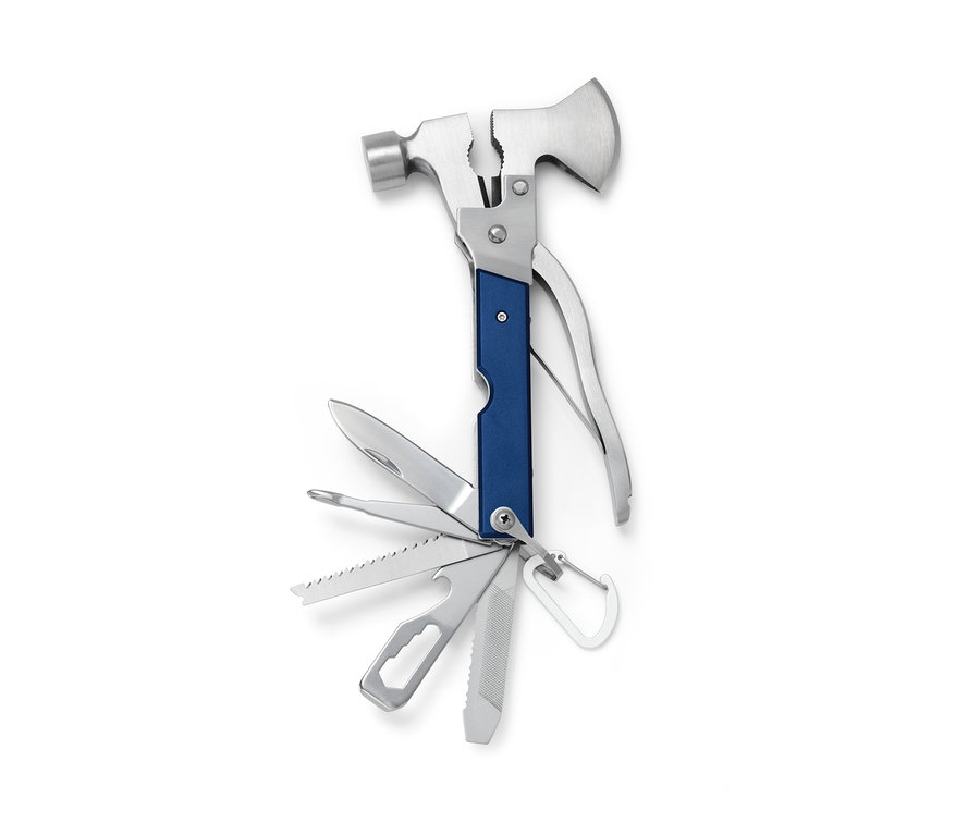 • 11 Funktionen: Axt, Hammer, Glattschliffmesser, Zange, Feile, Holzsäge, Säge, Kreuzschlitz-Schraubendreher, Schlitz-Schraubendreher, Schraubenschlüssel – 6, 7, 8, 10 mm und Flaschenöffner