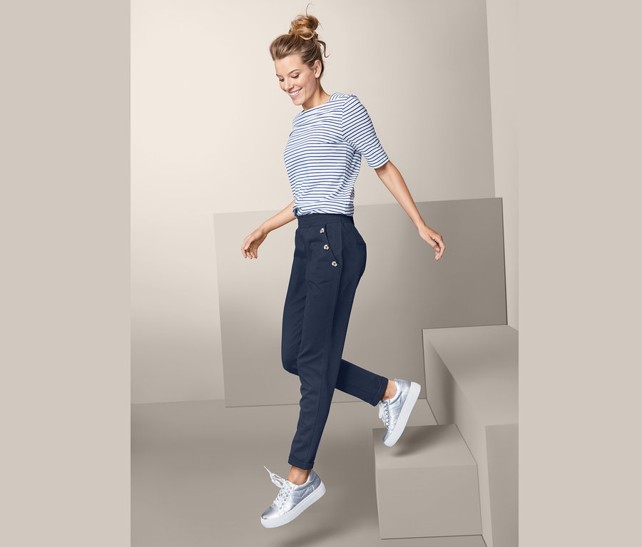 Diese knöchellange Sweathose im zeitlosen Blau ist die perfekte Freizeithose und setzt mit ihrer maritim angehauchten Optik bei jedem Outfit einen schönen Akzent. Mit ihrer weichen, elastischen Interlockqualität und der Bio-Baumwolle liegt die Damenhose jederzeit angenehm am Bein, Elasthan sorgt dabei für Formbeständigkeit und zusätzlichen Tragekomfort.