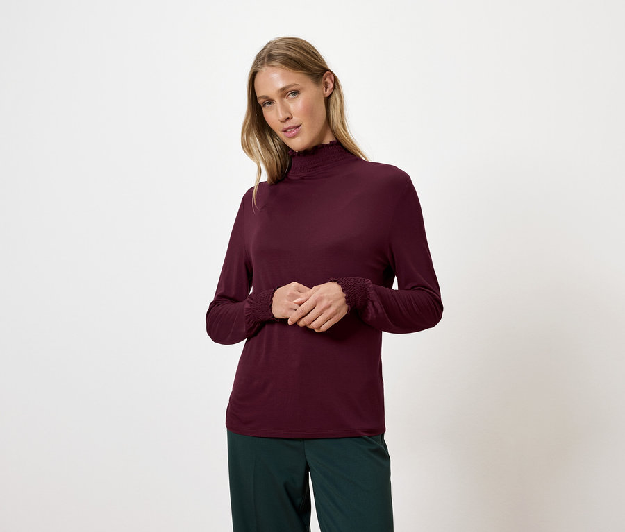 • Elastischer, gesmokter Ärmelabschluss und Stehkragen