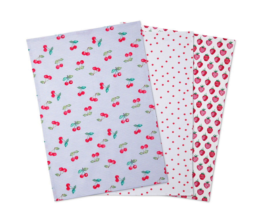 Zum Abtrocknen, Abdecken und Einpacken – Geschirrtücher sind ein absolutes Muss für jede Küche. Diese drei hier sind aus hochwertiger, reiner Baumwolle gefertigt und dadurch ausgesprochen saugfähig sowie fusselarm. Durch die dekorativen Obstmotive sorgen die Handtücher für fröhliche Farbtupfer. Aufhänger erleichtern die Aufbewahrung der Tücher.