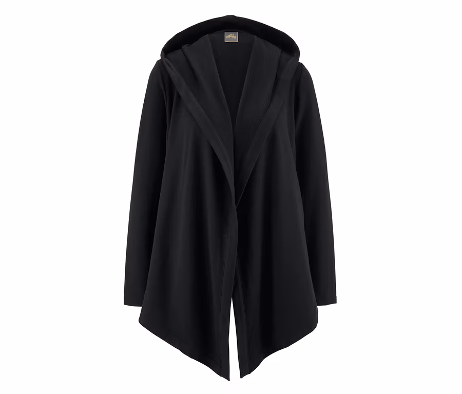 sehr locker geschnittene, legere Jacke, die vorne länger ist als hinten, so kann man sich die Vorderteile auch schön über den Bauch