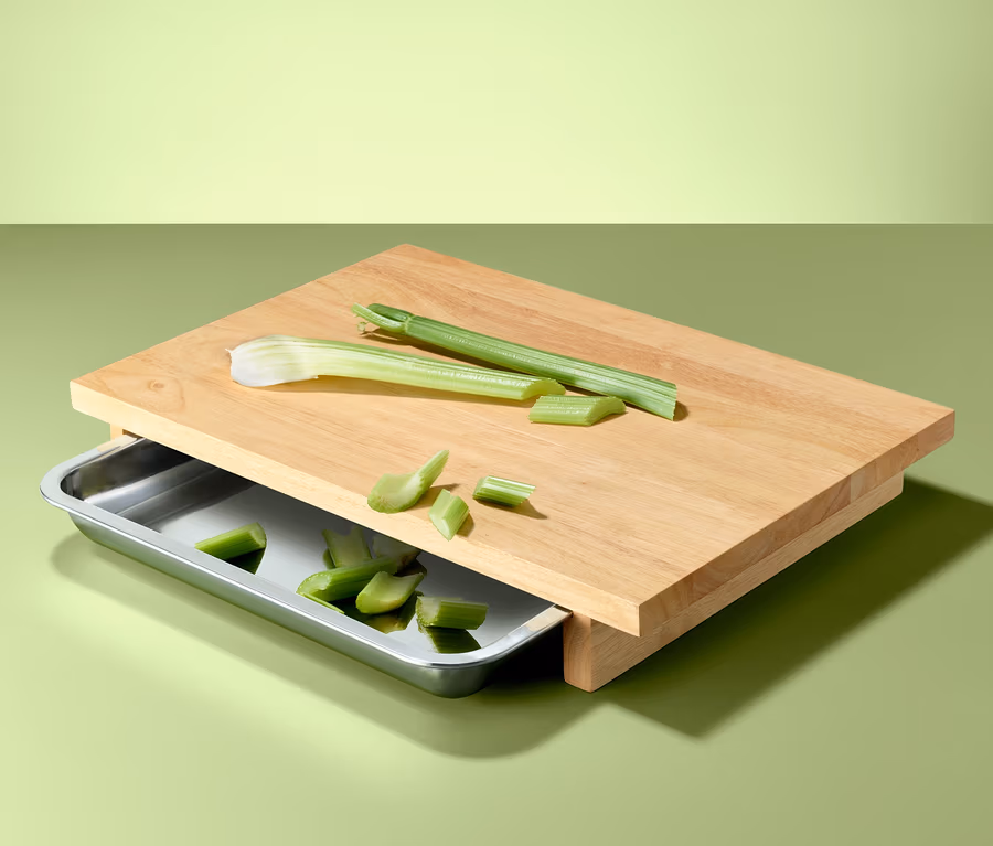 Immer schön, wenn jemand in der Küche mithilft – und sei es das Schneidebrett. Dieses Brett aus Kautschukholz bietet eine großzügige Schneidefläche und kann darüber hinaus mit seiner integrierten Auffangschale Punkte sammeln.