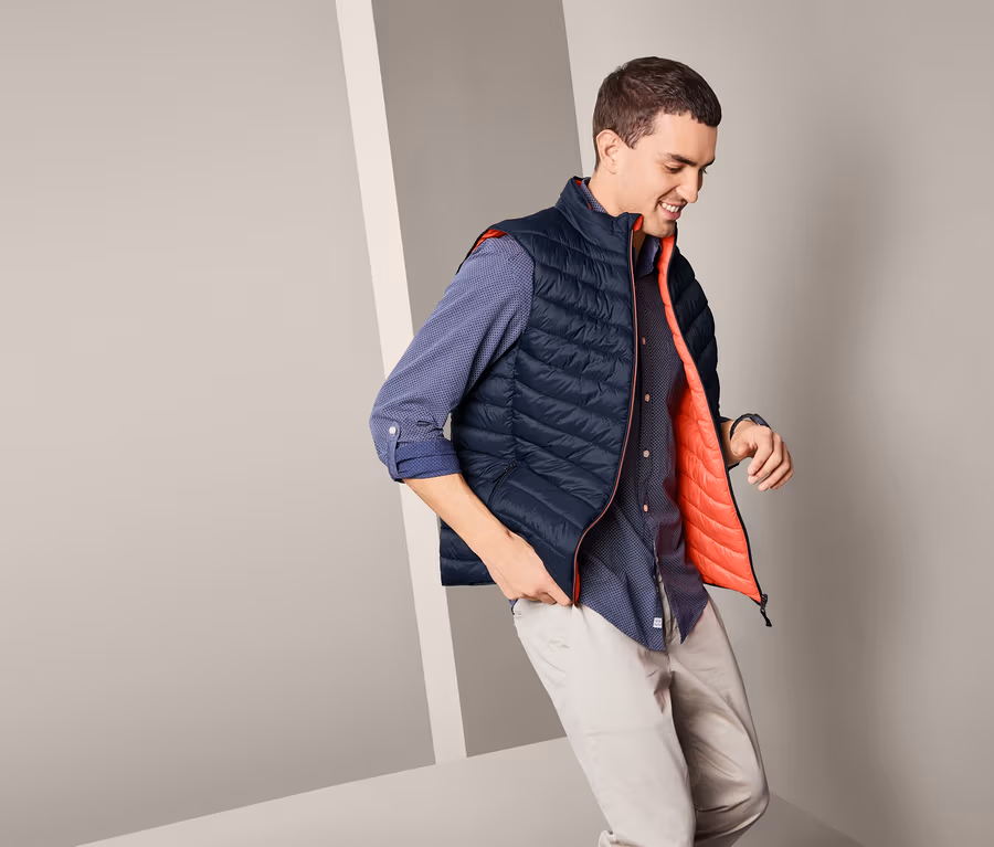 Gleich zwei klassische Looks bietet diese Wende-Steppweste: einmal in klassisch maritimem Dunkelblau und in der Signalfarbe Orange. Die blaue Seite verfügt dabei über zwei Reißverschlusstaschen, während die orangefarbene Seite mit zwei Eingrifftaschen ausgestattet ist. Die leichte, wärmende Wattierung sorgt zusammen mit dem Reißverschluss und einem hochschließenden Kragen für Schutz bei wechselnden Wetterverhältnissen.