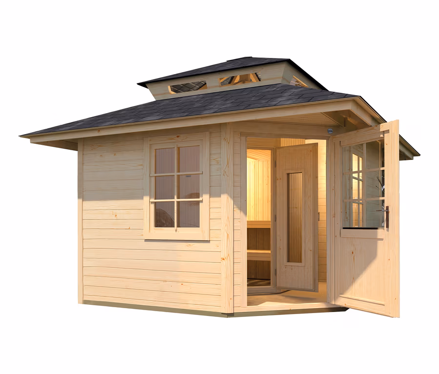 - Inkl. Holztür mit Sicherheits-Rollverschluss, Sauna-Spezial-Leuchtenset, 2 tiefer Liegen, Querliege und 2 Kopfstützen