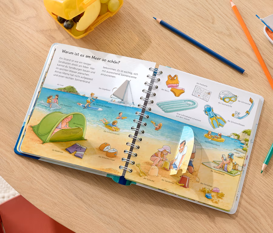 - Große Szenen und viele kleine Bilder zeigen, wie unterschiedlich man die Ferien verbringen kann, und begeistern auch für den Urlaub zu Hause. Unter spielerischen Klappen verbergen sich lustige Effekte und zusätzliche Begriffe