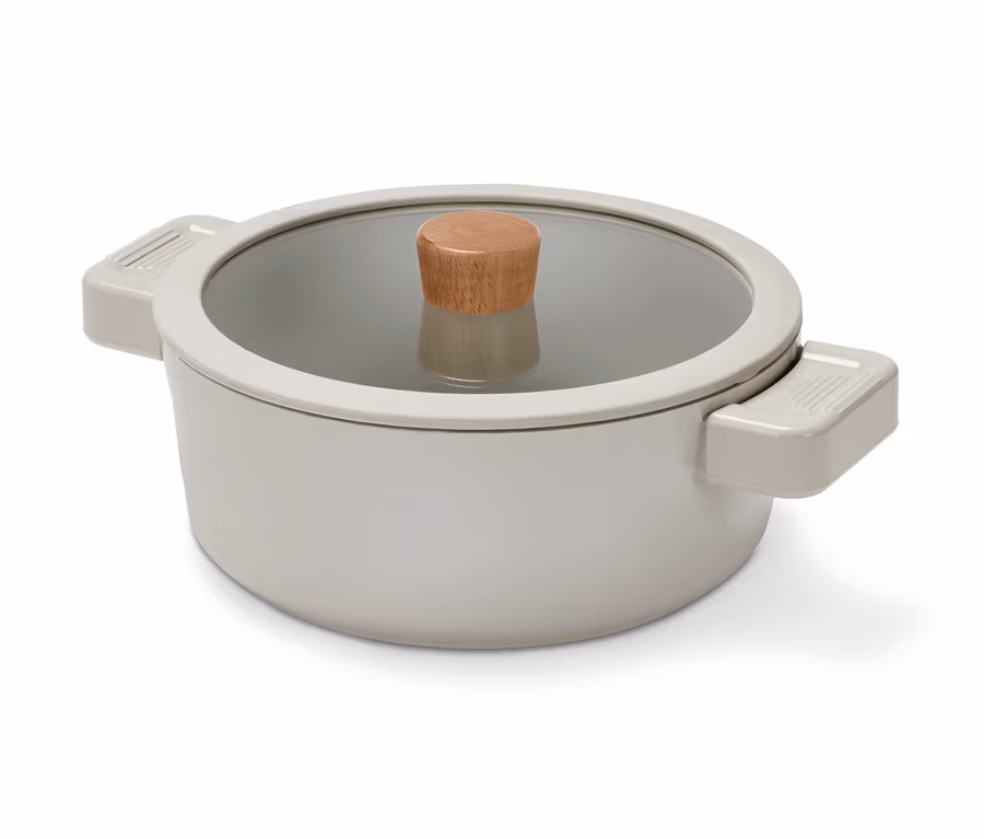 Hochwertige BeschichtungenDieser Kochtopf mit Glasdeckel ermöglicht modernes Kochen auf höchstem Geschmacksniveau. Der im Landhausstil designte und aus hochwertigem, gegossenem Aluminium gefertigte Kochtopf ist für alle Herdarten – Induktion ausgenommen – geeignet. Beim Deckel sorgt ein Silikonrand für hohe Stoßfestigkeit, verhindert Klappern und schont die Herdoberfläche beim Ablegen. Zusätzlich gibt es abnehmbare Silikonüberzieher.
