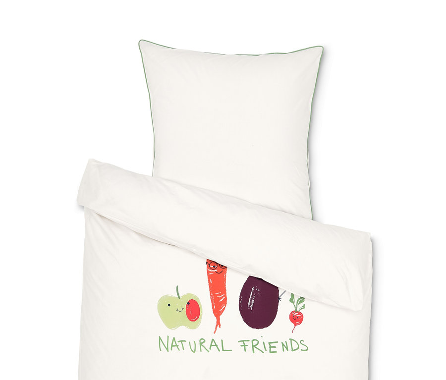 Begrüßt einen abends diese Perkal-Bettwäsche, freut man sich direkt darauf, ins Bett zu schlüpfen. Der niedliche Gemüse- und Obstprint in bunten Farben bringt dabei Kinderaugen zum Leuchten. Natürlich fühlt sich der Bezug auch toll an. Er ist besonders weich, leicht und glatt und außerdem aus feiner, dicht gewebter Qualität aus reiner Baumwolle. Einfach zu beziehen lassen sich Kissen- und Bettbezug dank ihres Hotelverschlusses. Und das Beste: Die Bettwäsche ist GOTS zertifiziert.