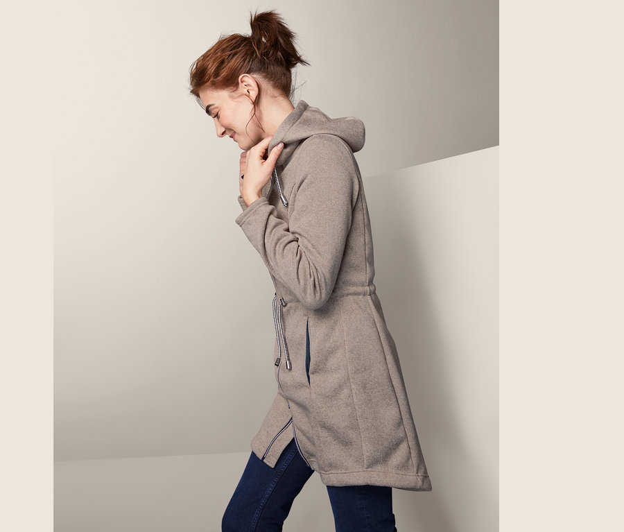 Eine besonders weiche, wärmende und atmungsaktive Fleecejacke ist an grauen Tagen ein Fels in der Brandung. Gerade wenn eine steife Brise weht, weiß die optimale Wärmeisolierung durch die weich angeraute Innenseite stark aufzutrumpfen. Diese Kapuzenjacke für Damen kommt mit hochschließendem Kragen, zwei seitlichen Eingrifftaschen und verstellbarer Taille durch Tunnelzug und Kordel. So ist Frau in der Jacke nicht nur gut geschützt, sondern kann sich auch pudelwohl fühlen.