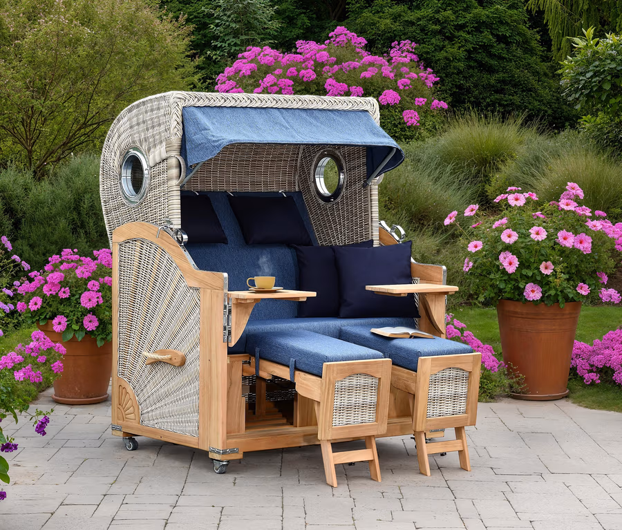- Inkl. Kissenausstattung, Markise, 2 Fußstützen, 2 Cocktailschwenktischen, 2 Bullaugen, 2 Transportgriffen, 4 Doppellenkrollen, Premium-Schutzhaube und Pflegehinweisen