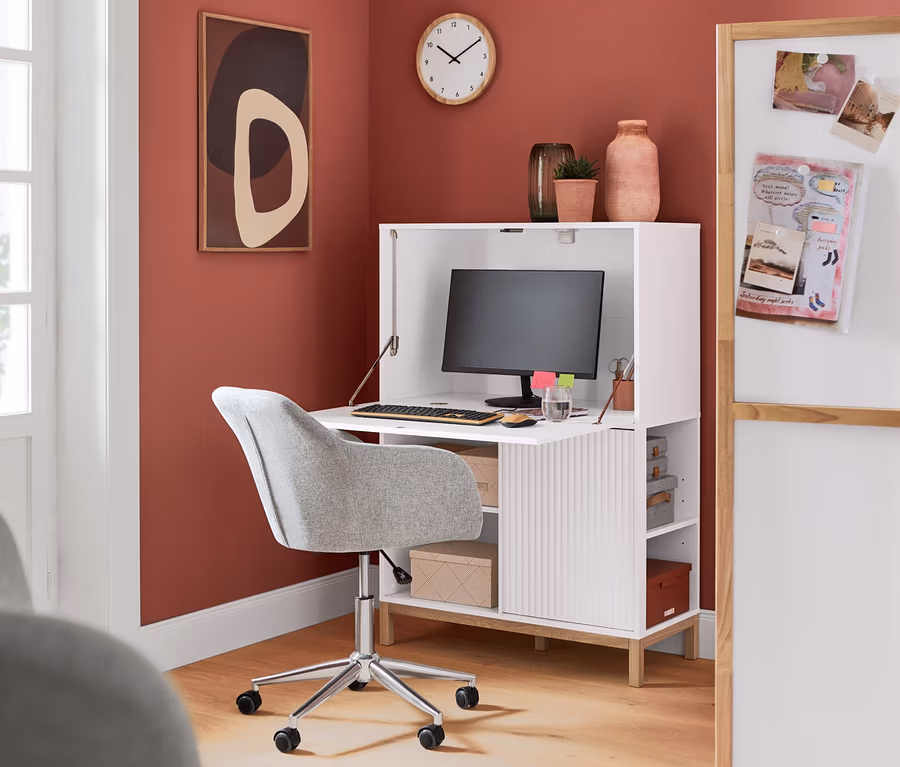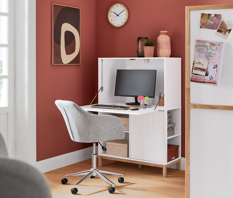 - Schreibtisch mit extra viel Stauraum hinter der Klappe – ideal für große Monitore