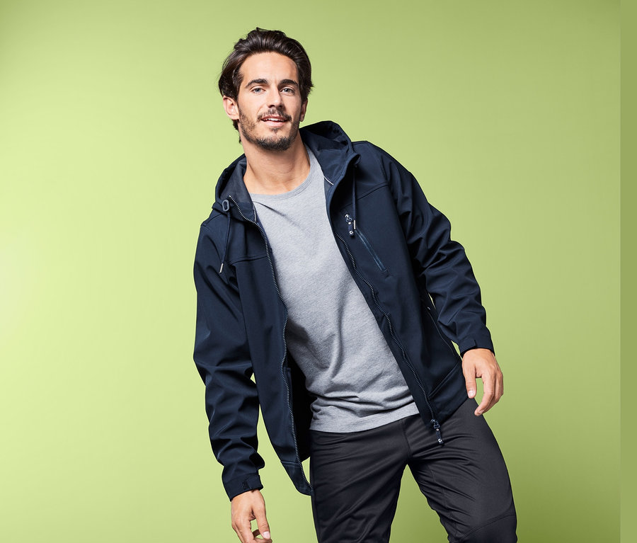 Diese dunkelblaue Softshelljacke ist der perfekte Anlass, um mal wieder rauszugehen. Ihr Obermaterial hält einer Wassersäule von bis zu 3.000 mm stand und ist somit wasserabweisend. Zudem ist es elastisch und garantiert dadurch einen hohen Tragekomfort und eine optimale Bewegungsfreiheit. Schmutzabweisend wird es durch die umweltschonende und strapazierfähige ecorepel®-Imprägnierung. Und falls es doch mal nass werden sollte: kein Problem, denn die Softshelljacke ist schnelltrocknend.