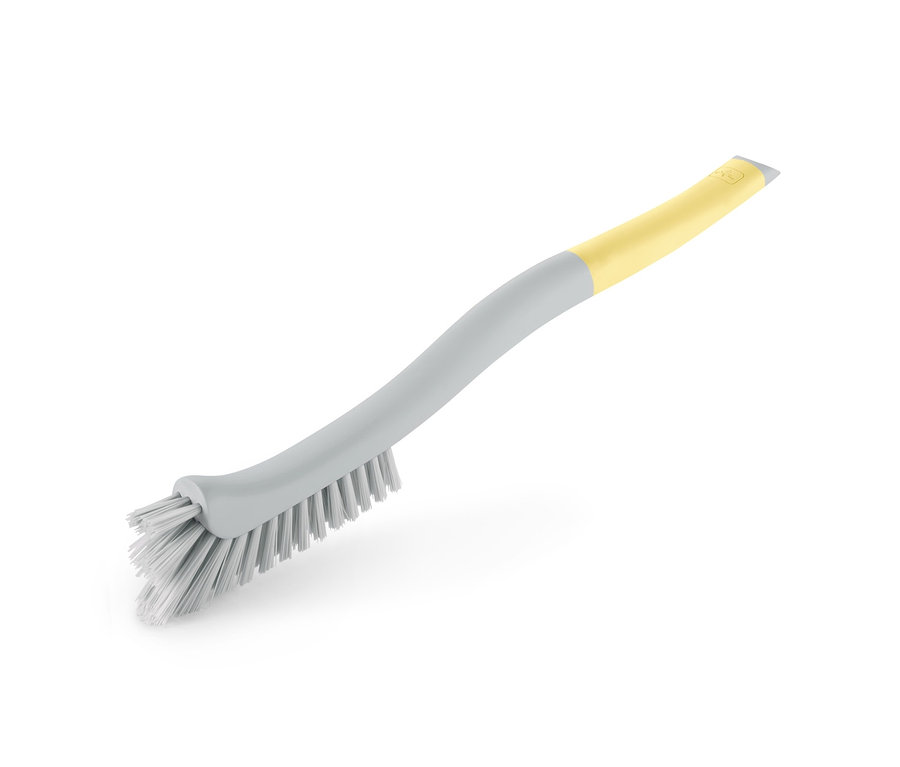 Bei hartnäckigen Verschmutzungen kommt der oberflächenschonende Schaber am Griffende zum Einsatz. Der Haushaltshelfer hat einen Griff mit rutschhemmendem Softgrip und liegt damit bei der Arbeit immer sicher in der Hand.