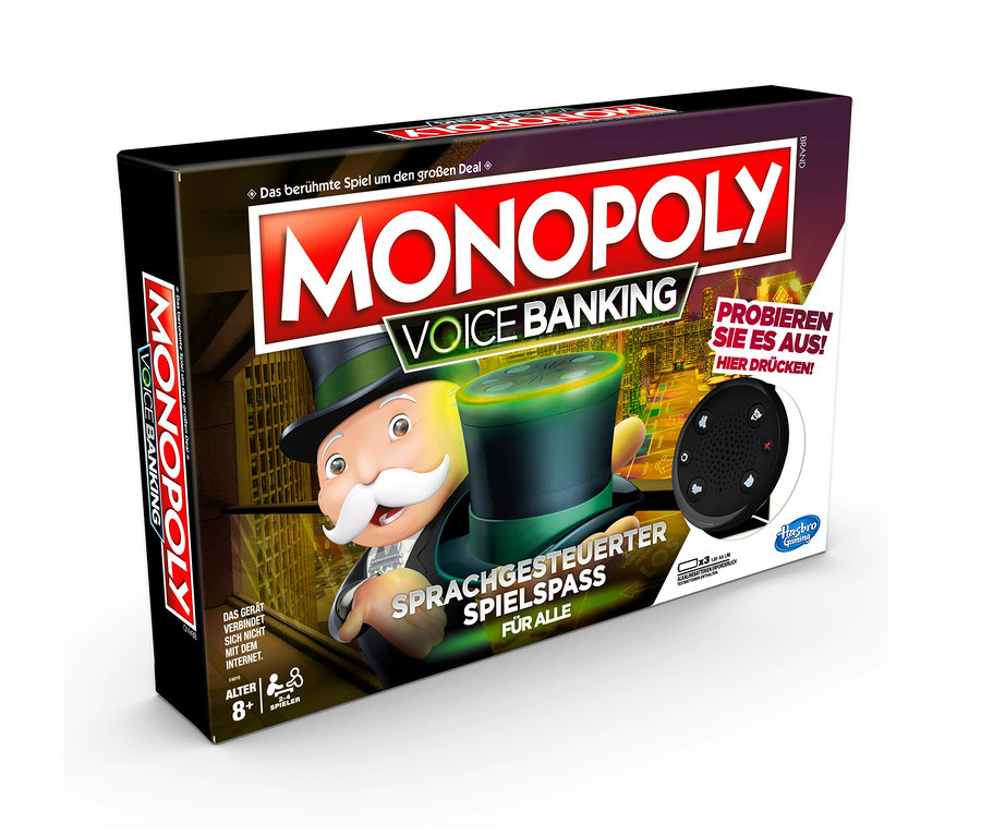 Manche Gesellschaftsspiele kann man nicht verbessern – man kann ihnen aber hin und wieder eine zeitgemäße Nuance hinzufügen. Genau das ist bei dem Brettspiel »Monopoly Voice Banking« der Fall. Wie immer geht es darum, möglichst viele Straßen zu kaufen, um Häuser und Hotels zu bauen, um seinen bedauernswerten Mitspielern das Geld aus der Tasche zu ziehen. Bei dieser Variante ist allerdings der Banking-Zylinder „Mr. Monopoly“ der heimliche Star, der mit Lichtern und Sounds auf sich aufmerksam macht. Darin steckt ein Sprachassistent, der auf Fragen antwortet, die Kontostände überwacht und auf Anweisungen reagiert. Am liebsten natürlich auf den Satz: „Mr. Monopoly, kaufe die Schlossallee.“