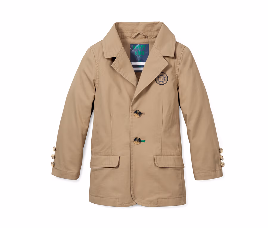Die Jacke ist mit einem Obermaterial aus reinem Baumwoll-Twill gefertigt und ihre Ärmel sind mit Taftfutter ausgestattet, sodass sie sich problemlos an- und ausziehen lässt. Der lässige Look bekommt durch die Knöpfe in Hornoptik einen eleganten Touch und der Badge auf der Brust setzt einen zusätzlichen Akzent. Das Kinder-Sakko ist klassisch geschnitten, hat zwei Vordertaschen mit Überschlag und einen Schlitz an der Rückseite.