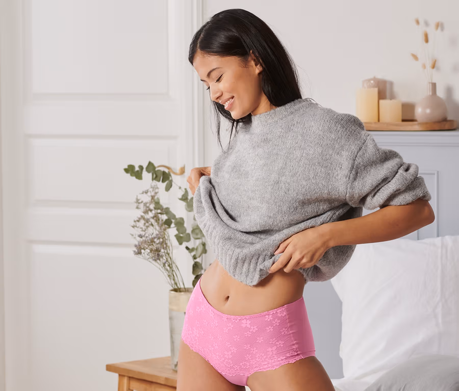- Leicht figurformendes Material im Bauchbereich mit zartem Spitzenbesatz