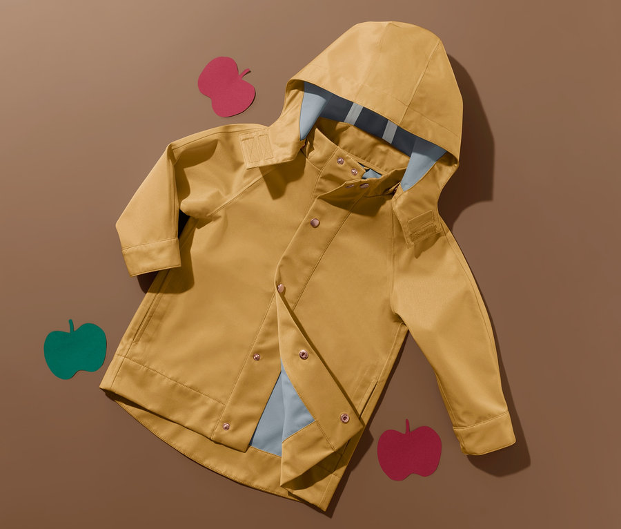Die Regenjacke kann mit einem besonders angenehmen Tragegefühl punkten und dank der Druckknöpfe lässt sie sich besonders einfach an- und ausziehen. Sie hat zwei Eingrifftaschen, die Kapuze ist mit Druckknöpfen befestigt und lässt sich abnehmen – und auf der Rückseite sorgt ein Reflektor in Apfelform auch bei schwierigen Lichtverhältnissen für eine bessere Sichtbarkeit.