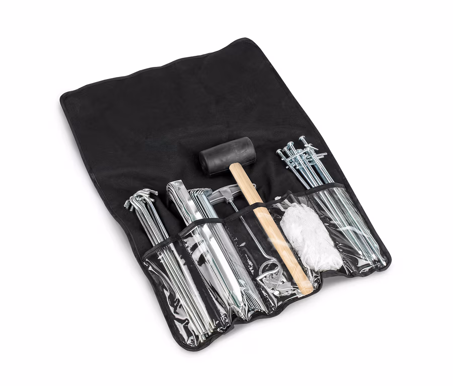 - Inkl. Gummihammer, Heringzieher, 3 Dreilochspannern, 2 Heringlaschen, 20-m-Zeltleine, 40 Zeltheringen und Rolltasche