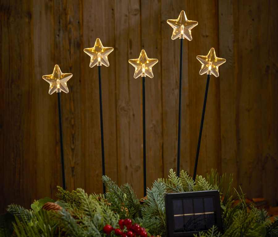 • 5 Leuchtstäbe mit LED-Sternen in 2 unterschiedlichen Höhen: 3x 83,5 und 2x 104 cm