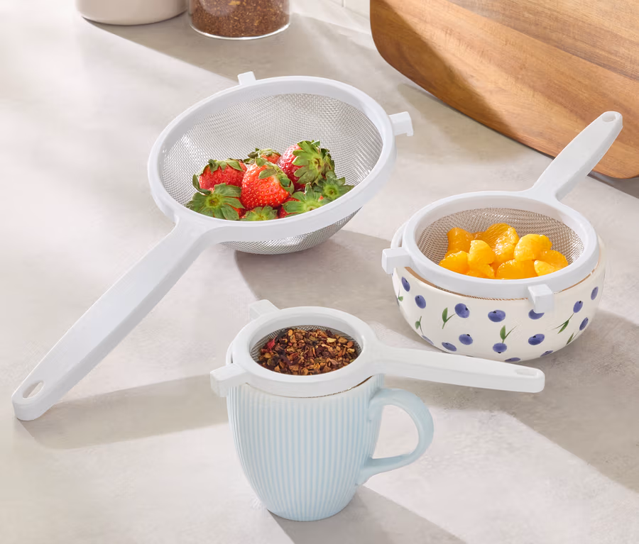 - Kleines, feinmaschiges Sieb zum Aufbrühen von losem Tee oder zum Bestreuen von Gebäck mit Puderzucker etc.