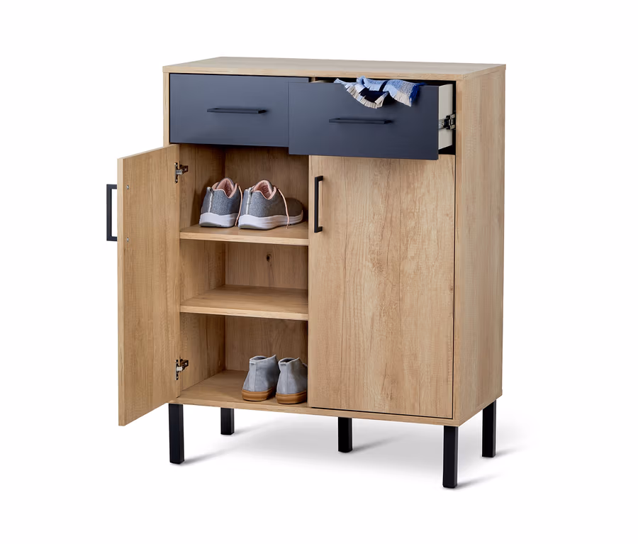 Der Flurschrank bietet hinter zwei Türen mit je einem Einlegeboden sichtgeschützten Stauraum und viel Platz für Schuhe. In den beiden geräumigen Schubladen wiederum ist Platz für Accessoires wie Handschuhe oder natürlich für Putzzeug. Das Möbel ist made in Germany und aus melaminharzbeschichteter Holzwerkstoffplatte mit Griffen und Füßen aus mattiertem Stahl gefertigt. Dank der Filzbodenschoner kann das Möbel auch auf empfindlicheren Böden wie Parkett genutzt werden.
