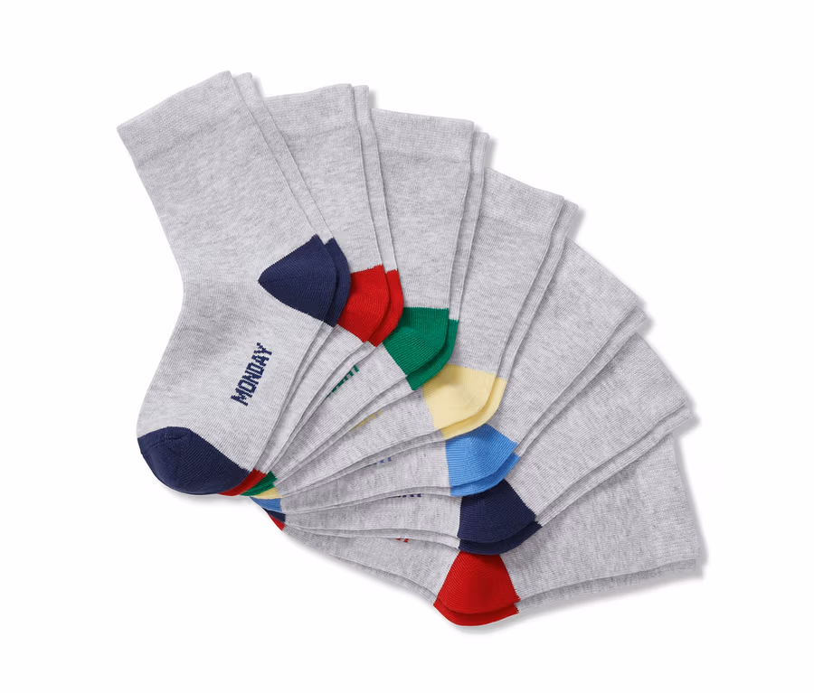 Eine Woche voller Komfort: Mit diesen Kindersocken haben die Kleinen bequeme Begleiter für jeden Tag – und der steht auch direkt drauf. Die Söckchen sind mit Bio-Baumwolle gefertigt, Elasthan sorgt dabei für Formbeständigkeit, einen perfekten Sitz und hohen Tragekomfort – perfekt, wenn man einen aktiven Tag vor sich hat. Die weichen, elastischen Bündchen verhindern ein Einschnüren, Spitzen und Fersen sind verstärkt – und die flache, weiche Zehennaht verleiht den Socken zusätzlichen Komfort.