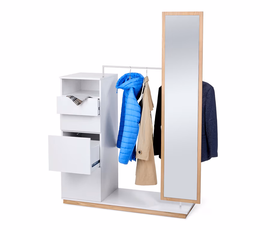 - 3-in-1-Funktion: Schubladenturm, Kleiderstange und Spiegel