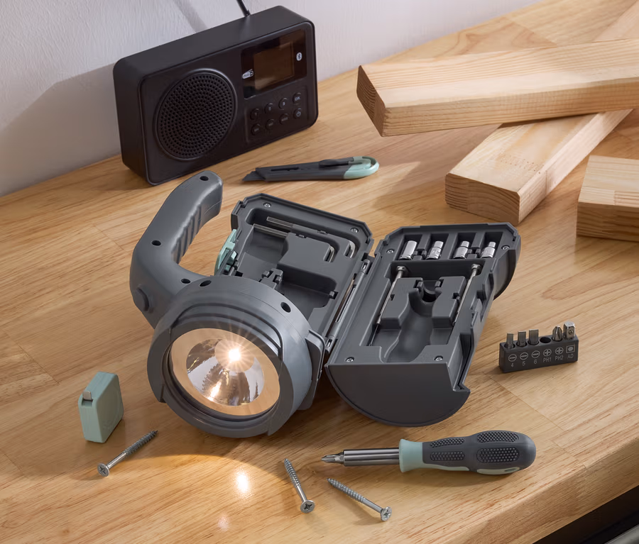 - Lampe mit Griff und integriertem Werkzeugset