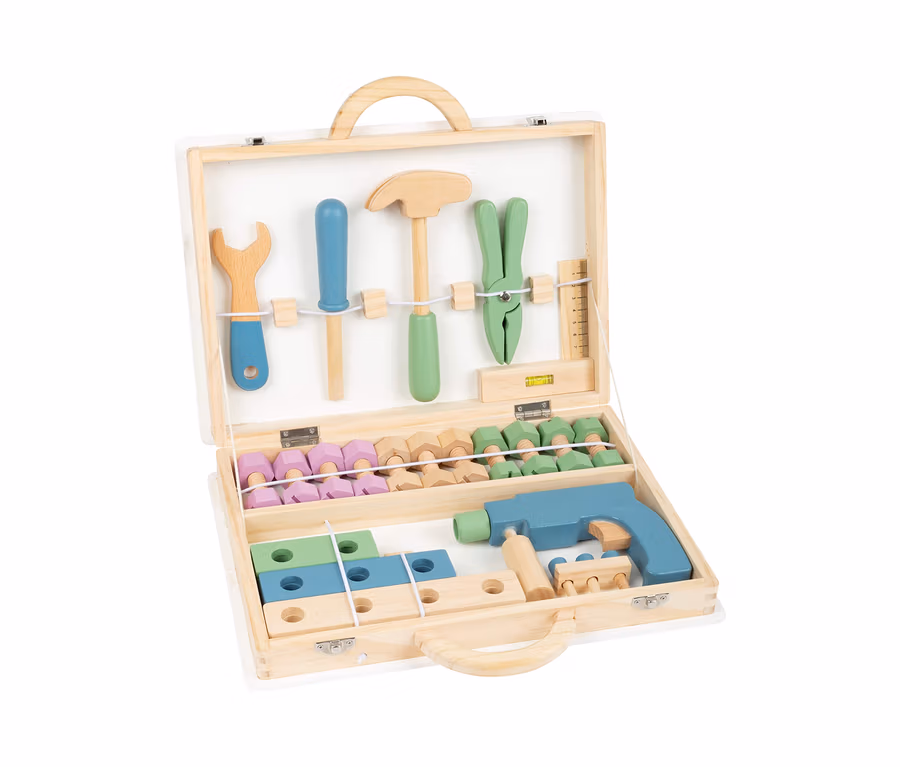 - Inkl. 6 Werkzeugen aus Holz: Hammer, Schraubenschlüssel, Schraubendreher, Zange, Tischlerwinkel mit Wasserwaage, Akkuschrauber mit magnetischen Bits