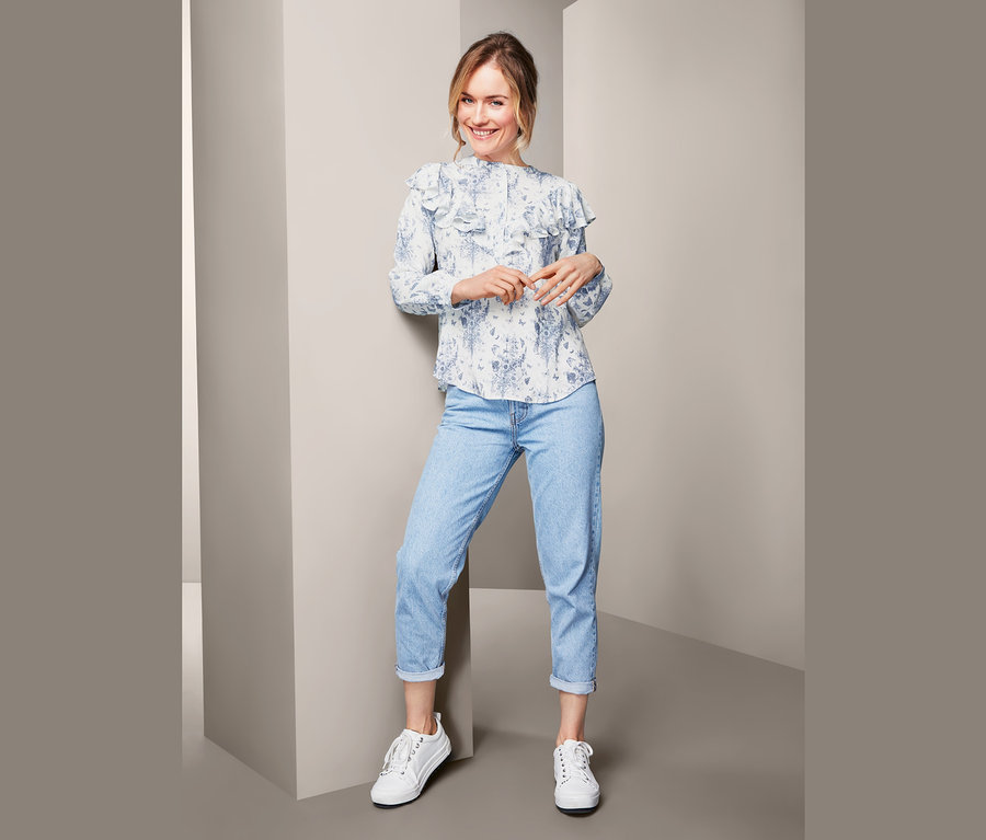 An wärmeren Tagen haben wir es gerne sommerlich leicht – und da kann diese Bluse gleich doppelt punkten. Mit ihrer weich fließenden, reinen Viskose liegt sie besonders angenehm auf der Haut und der frische florale Alloverprint verleiht ihr in Kombination mit der angesetzten Rüschenborte einen leichten, romantisch angehauchten Look. Das Damenoberteil hat einen Rundhalsausschnitt mit Knopfleiste, einen leicht abgerundeten Saum sowie geknöpfte Manschetten. Ideal für jedes Freizeit-Outfit, aber auch für besondere Anlässe.