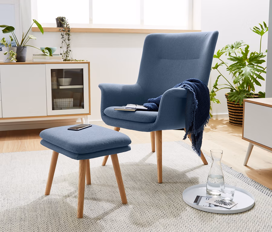 Sitzschale und Rückenlehne sind fest gepolstert und bieten einen besonders hohen Sitzkomfort, der durch das zusätzliche, befestigte Sitzkissen noch erhöht wird. Das Untergestell ist wie die Füße aus naturfarbenem Eichen-Massivholz – und der passende Fußhocker ist auch gleich mit dabei. Die hochwertigen Bezüge sind besonders strapazierfähig und halten mindestens 20.000 Scheuertouren stand. Schließlich will man von Lieblingsmöbeln ein bisschen länger etwas haben.