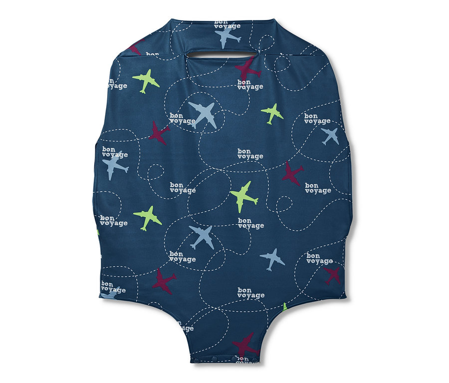 Der Überzug ist dehnbar, eignet sich für Koffer mit einer Höhe von etwa 67 bis 77 Zentimetern und lässt sich besonders einfach aufziehen. Löcher für Griffe und Rollen sorgen für eine besonders komfortable Handhabung. Die Schutzhülle wird am unteren Kofferende verschlossen und hat einen Klettverschluss.