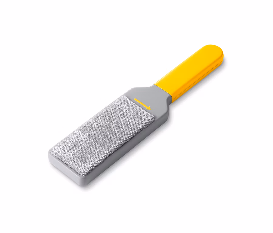 Damit die Fusselbürste auch nach vielen Anwendungen ihre Funktion erfüllen kann, ist sie mit einem Standfuß ausgestattet, der gleichzeitig als Reinigungsstation dient. Durch eine Auf- und Abbewegung in der Station lassen sich Fusseln schnell und leicht von der Bürste lösen.