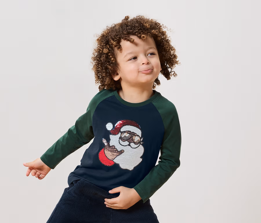 - Dunkelblau mit tannengrünen Raglan-Ärmeln und rot-weißem Weihnachtsmann-Motiv